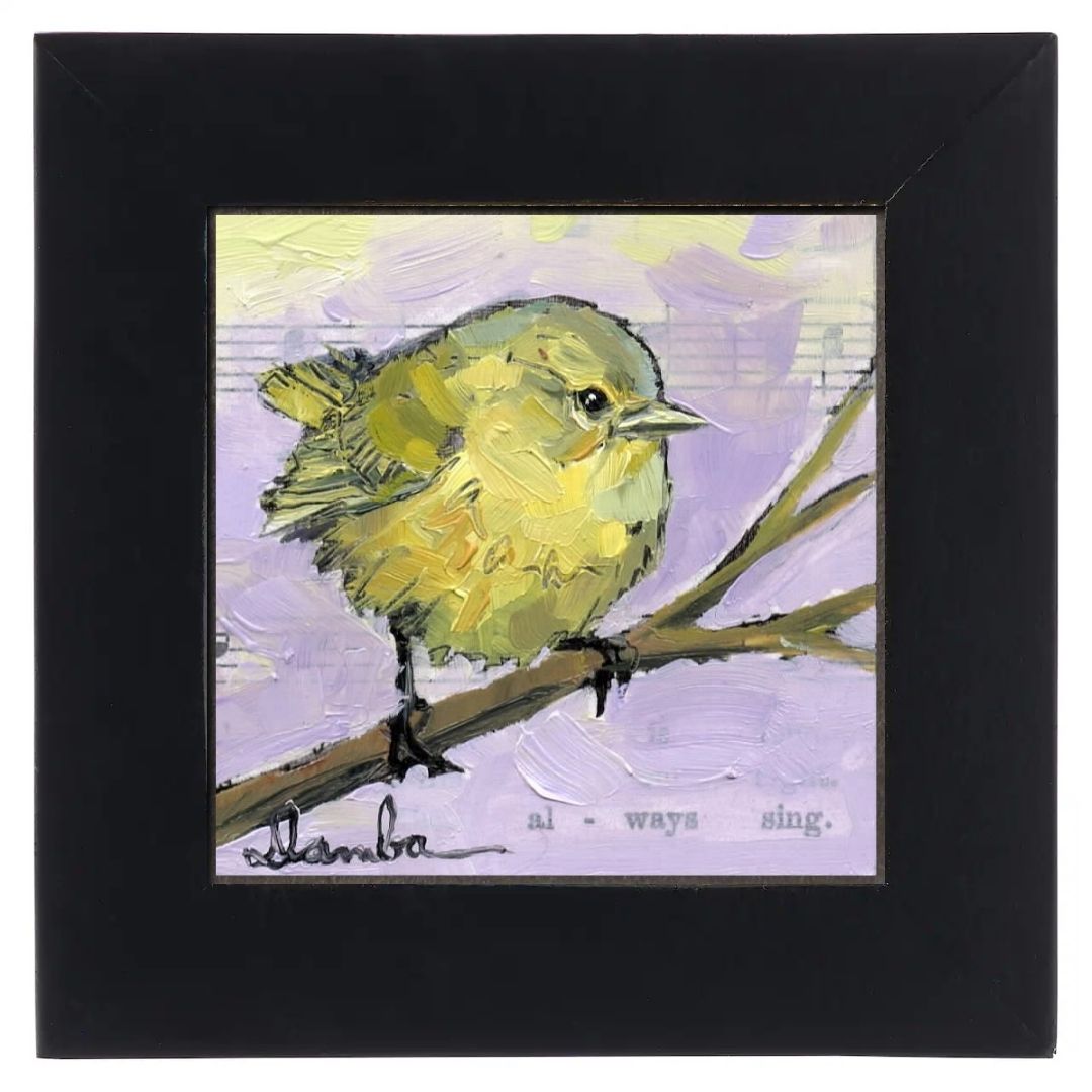 Nature-inspired original oil paintings. These charming 2.5x2.5" paintings are specially crafted for their frames and feature songbirds, landscapes, flowers, and more.