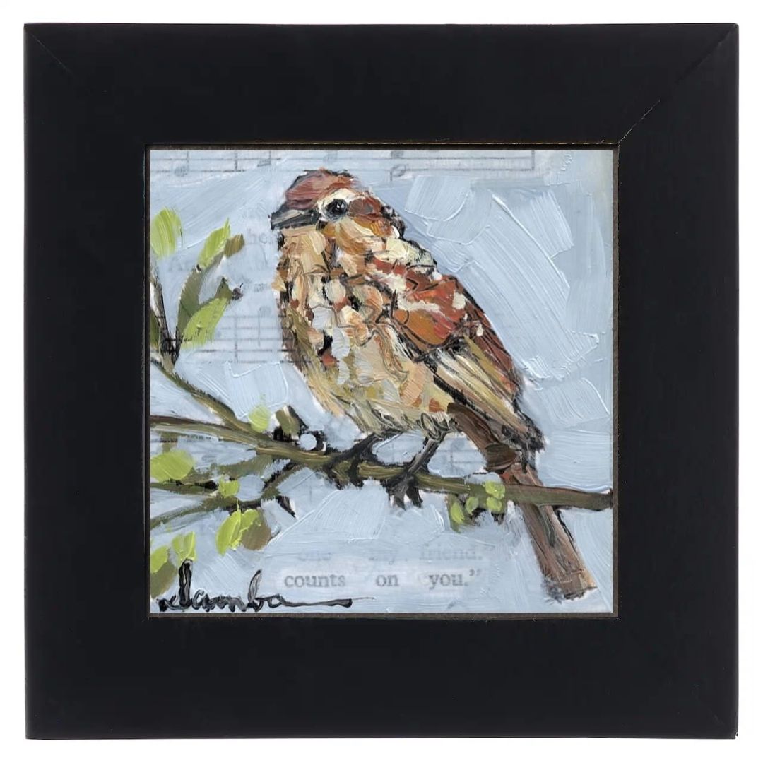 Nature-inspired original oil paintings. These charming 2.5x2.5" paintings are specially crafted for their frames and feature songbirds, landscapes, flowers, and more.