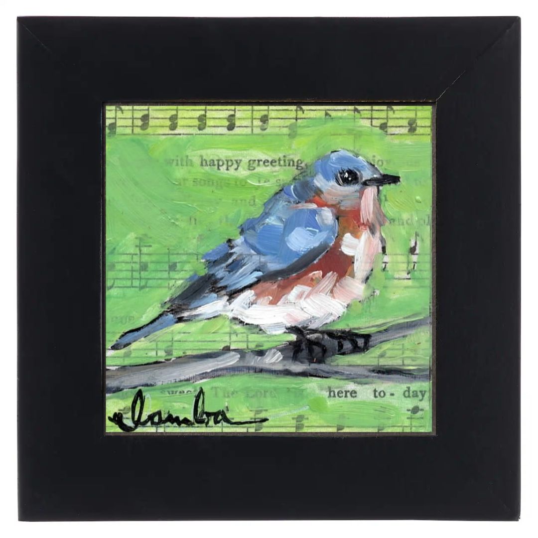Nature-inspired original oil paintings. These charming 2.5x2.5" paintings are specially crafted for their frames and feature songbirds, landscapes, flowers, and more.
